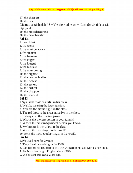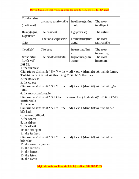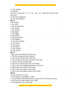 Comfortable the most comfortable Intelligent(thông The most (thoải mái) minh) intelligent Heavy(nặng) The heaviest Ugly(xấu xí) The ugliest Expensive The most expensive Fashionable(thời The most (đắt) trang) fashionable Good(tốt) The best Interesting(thú The most vị) interesting Wonderful The most wonderful Important(quan The most (tuyệt vời) trọng) important Bài 11. 1. the funniest