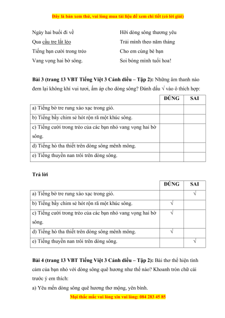 đem lại không khí vui tươi, ấm áp cho dòng sông? Đánh dấu √ vào ô thích hợp: ĐÚNG SAI