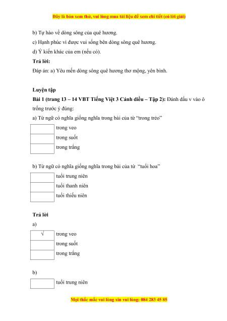 b) Từ ngữ có nghĩa giống nghĩa trong bài của từ “tuổi hoa” tuổi trung niên tuổi thanh niên tuổi thiếu niên Trả lời a) √ trong veo trong suốt trong trắng b) tuổi trung niên
