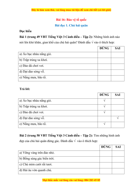 nói lên khó khăn, gian khổ của chú hải quân? Đánh dấu √ vào ô thích hợp: ĐÚNG SAI