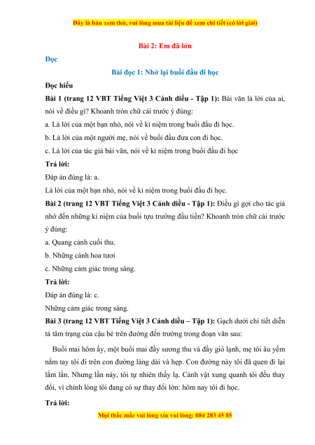 Đây là bản xem thử, vui lòng mua tài liệu để xem chi tiết (có lời giải) Bài 2: Em đã lớn Đọc