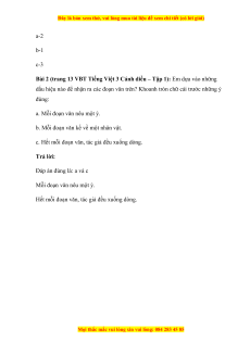 - Tailieugiaovien.com.vn giới thiệu giải vbt Tiếng Việt lớp 3 Cánh diều hay nhất, chi tiết đầy đủ Tập 1 sẽ giúp học sinh dễ dàng làm bài tập Tiếng Việt lớp 3, từ đó đạt điểm cao trong các bài thi môn Tiếng Việt 3.