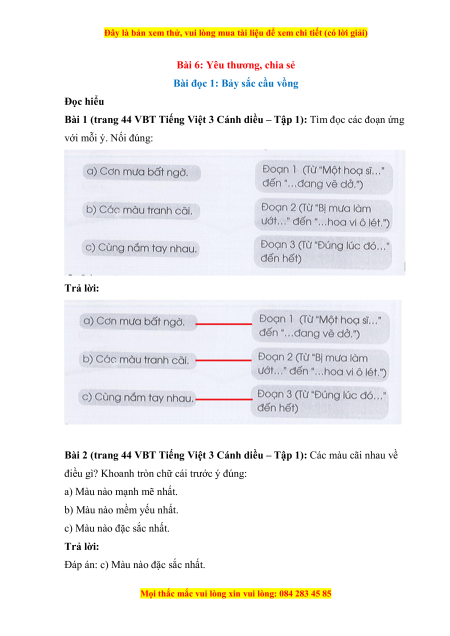 Bài 1 (trang 44 VBT Tiếng Việt 3 Cánh diều – Tập 1): Tìm đọc các đoạn ứng với mỗi ý. Nối đúng: Trả lời: