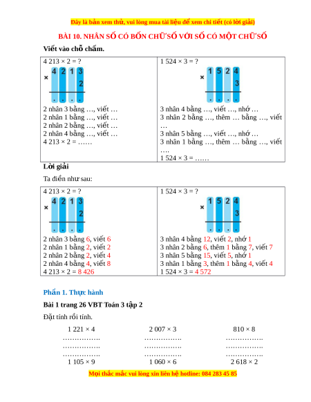 ệ đ xe ể m chi ti t (c ế ó lời gi i ả ) BÀI 10. NHÂN S C Ố Ó B N Ố CH S Ữ Ố V I Ớ S C Ố Ó M T Ộ CH S Ữ Ố Vi t ế vào chỗ chấm. 4 213 × 2 = ? 1 524 × 3 = ? 2 nhân 3 b ng …, vi ằ t ế … 3 nhân 4 b ng ằ …, vi t ế …, nh … ớ 2 nhân 1 b ng …, vi ằ t ế … 3 nhân 2 b ng ằ …, thêm … b ng ằ …, vi t ế 2 nhân 2 b ng …, vi ằ t ế … … 2 nhân 4 b ng …, vi ằ t ế … 3 nhân 5 b ng ằ …, vi t ế …, nh … ớ 4 213 × 2 = …… 3 nhân 1 b ng ằ …, thêm … b ng ằ …, vi t ế …. 1 524 × 3 = …… L i ờ giải Ta đi n nh ề s ư au: 4 213 × 2 = ? 1 524 × 3 = ? 2 nhân 3 b ng ằ 6, vi t ế 6 3 nhân 4 b ng ằ 12, vi t ế 2, nh ớ 1 2 nhân 1 b ng ằ 2, vi t ế 2 3 nhân 2 b ng ằ 6, thêm 1 b ng ằ 7, vi t ế 7 2 nhân 2 b ng ằ 2, vi t ế 4 3 nhân 5 b ng ằ 15, vi t ế 5, nh ớ 1 2 nhân 4 b ng ằ 4, vi t ế 8 3 nhân 1 b ng ằ 3, thêm 1 b ng ằ 4, vi t ế 4 4 213 × 2 = 8 426 1 524 × 3 = 4 572 Phần 1. Th c hành ự