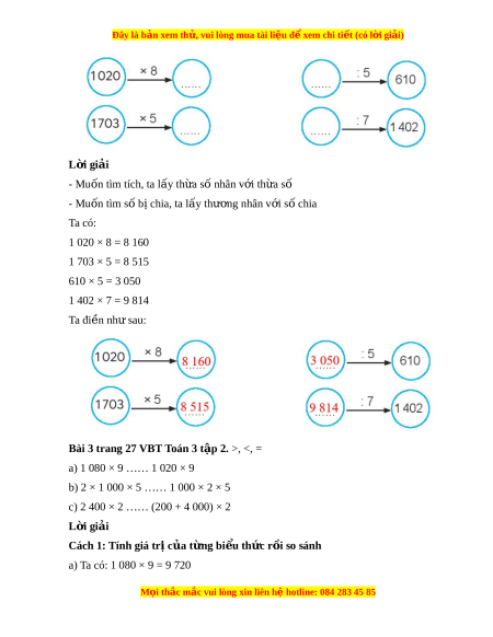 ệ đ xe ể m chi ti t (c ế ó lời gi i ả ) L i ờ giải - Muốn tìm tích, ta l y t ấ h a s ừ nhân ố v i ớ th a s ừ ố - Muốn tìm s b ố chi ị a, ta l y t ấ hư ng ơ nhân v i ớ s chi ố a Ta có: 1 020 × 8 = 8 160 1 703 × 5 = 8 515 610 × 5 = 3 050 1 402 × 7 = 9 814 Ta đi n nh ề s ư au: