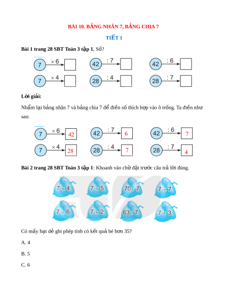 ể ìm ra các phép tính có k t ế qu ả bé h n ơ 35. Ta có: 7 × 4 = 28 7 × 5 = 35 70 : 7 = 10 7 × 7 = 49 7 × 6 = 42 7 × 2 = 14 63 : 7 = 9 7 × 3 = 21 Các phép tính có k t ế qu bé h ả n 35 l ơ à: 7 × 4 70 : 7 7 × 2 63 : 7 7 × 3 V y ậ có 5 h t ạ d ghi ẻ phép tính có k t ế qu bé h ả n 35 ơ .