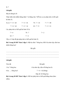 …………………………………………………………………………………………… L i ờ giải Tóm t t ắ Bài gi i ả 1 l : ọ 7 bông hoa 6 l nh ọ v ư y ậ c m ắ số bông hoa là: 6 l : ọ …. bông hoa? 7 × 6 = 42 (bông) Đáp số: 42 bông hoa