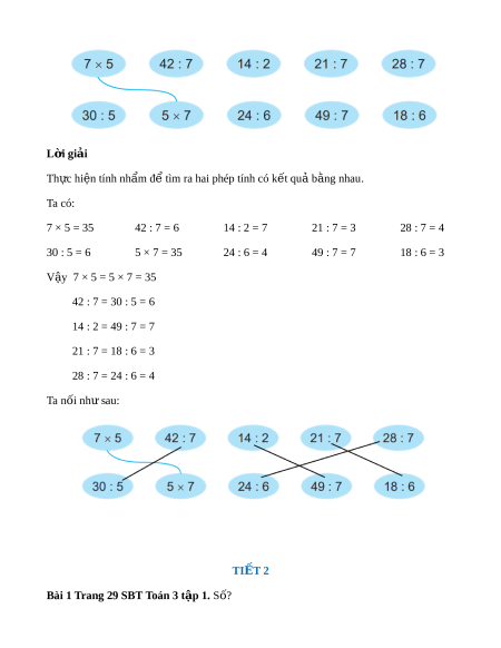 ẩ để tìm ra hai phép tính có k t ế qu b ả ng nhau ằ . Ta có: 7 × 5 = 35 42 : 7 = 6 14 : 2 = 7 21 : 7 = 3 28 : 7 = 4 30 : 5 = 6 5 × 7 = 35 24 : 6 = 4 49 : 7 = 7 18 : 6 = 3 V y ậ 7 × 5 = 5 × 7 = 35 42 : 7 = 30 : 5 = 6 14 : 2 = 49 : 7 = 7 21 : 7 = 18 : 6 = 3 28 : 7 = 24 : 6 = 4 Ta nối nh s ư au: TI T Ế 2