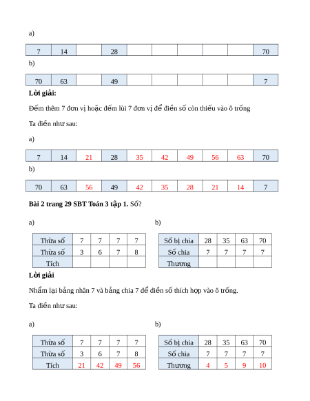 Bài 2 trang 29 SBT Toán 3 t p 1. ậ Số? a) b) Th a ừ số 7 7 7 7 Số bị chia 28 35 63 70 Th a ừ số 3 6 7 8 Số chia 7 7 7 7 Tích Thư ng ơ L i ờ giải Nhẩm l i ạ b ng ả nhân 7 và b ng ả chia 7 đ đi ể n s ề t ố hích h p ợ vào ô tr ng. ố Ta đi n nh ề s ư au: a) b) Th a ừ số 7 7 7 7 Số bị chia 28 35 63 70 Th a ừ số 3 6 7 8 Số chia 7 7 7 7 Tích 21 42 49 56 Thư ng ơ 4 5 9 10