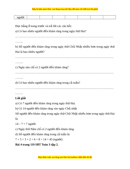 ……………………………………………………………………………………… …….. L i ờ giải a) Có 7 ngư i ờ đ n khám ế răng trong ngày thứ Hai. b) Có 14 ngư i ờ đ n khám ế răng vào ngày Chủ nh t ậ Số ngư i ờ đ n
