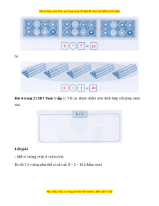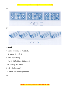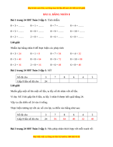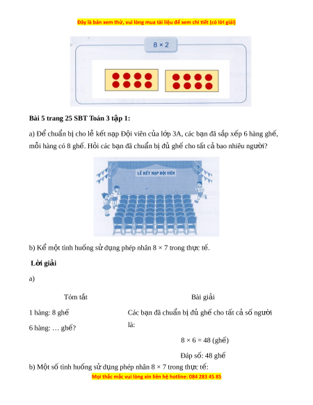 ụ phép nhân 8 × 7 trong th c ự tế. L i ờ giải a) Tóm t t ắ Bài gi i ả 1 hàng: 8 ghế Các b n đã chu ạ n b ẩ đ ị gh ủ cho t ế t ấ cả s ng ố ư i ờ 6 hàng: … gh ? ế là: 8 × 6 = 48 (gh ) ế Đáp số: 48 ghế b) M t