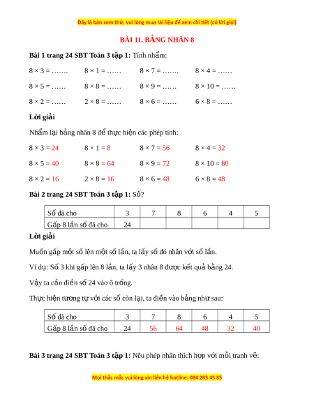 Bài 2 trang 24 SBT Toán 3 t p 1 ậ : Số? Số đã cho 3 7 8 6 4 5 Gấp 8 lần số đã cho 24 L i ờ giải Muốn gấp m t ộ số lên m t ộ số lần, ta l y s ấ ố đó nhân v i ớ s l ố n ầ . Ví d : ụ Số 3 khi g p l ấ ên 8 l n, t ầ a l y 3 nhân 8 đ ấ ư c ợ k t ế qu b ả ng ằ 24. V y ậ ta c n đi ầ n s ề ố 24 vào ô trống. Th c hi ự n t ệ ư ng t ơ v ự i ớ các s còn l ố i ạ , ta đi n vào b ề ng nh ả s ư au: Số đã cho 3 7 8 6 4 5 Gấp 8 lần số đã cho 24 56 64 48 32 40