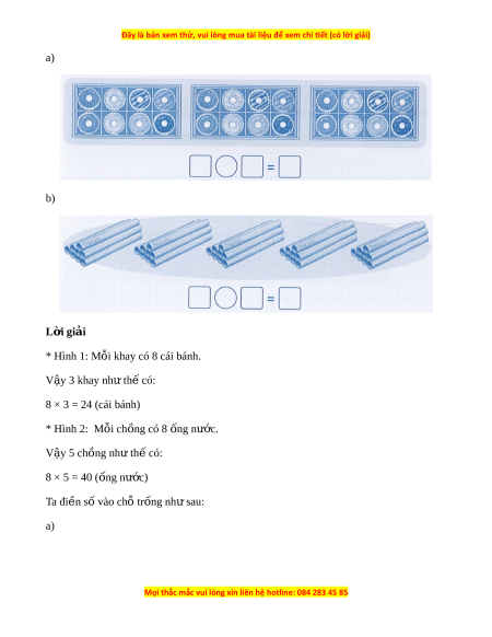 * Hình 1: Mỗi khay có 8 cái bánh. V y ậ 3 khay nh t ư h có: ế 8 × 3 = 24 (cái bánh) * Hình 2: Mỗi ch ng có 8 ồ ng n ố ư c. ớ V y ậ 5 chồng nh t ư h có: ế 8 × 5 = 40 ( ng n ố ư c) ớ Ta đi n s