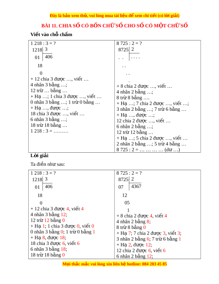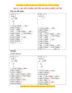 ệ đ xe ể m chi ti t (c ế ó lời gi i ả ) BÀI 11. CHIA S C Ố Ó B N Ố CH S Ữ C Ố HO S C Ố Ó M T Ộ CH S Ữ Ố Vi t ế vào chỗ chấm 1 218 : 3 = ? 8 725 : 2 = ? 1218 3 8725 2 01 406 . . . . . . 18 . . 0 . . + 12 chia 3 đư c ợ …, vi t ế … . 4 nhân 3 b ng …; ằ + 8 chia 2 đư c ợ …, vi t ế … 12 tr … b ừ ng ằ … 4 nhân 2 b ng …; ằ + H …; ạ 1 chia 3 được …, vi t ế … 8 tr 8 b ừ ng ằ …. 0 nhân 3 b ng …; ằ 1 tr 0 b ừ ng ằ … + H …; ạ 7 chia 2 được …, vi t ế …; + H …, đ ạ ư c ợ …; 3 nhân 2 b ng …; ằ 7 tr 6 b ừ ng ằ … 18 chia 3 đư c ợ …, vi t ế … + H …, đ ạ ư c ợ …; 6 nhân 3 b ng …; ằ 12 chia 2 đư c ợ …, vi t ế … 18 tr 18 b ừ ng ằ … 6 nhân 2 b ng …; ằ 1 218 : 3 = ……… 12 tr 12 b ừ ng ằ … + H …; ạ 5 chia 2 được …, vi t ế … 2 nhân 2 b ng …; ằ 5 tr 4 b ừ ng ằ …