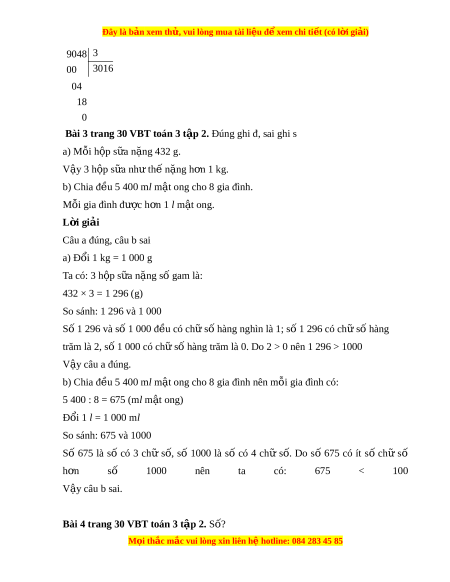 Bài 3 trang 30 VBT toán 3 t p 2. ậ Đúng ghi đ, sai ghi s a) Mỗi h p s ộ a ữ n ng 432 g. ặ V y 3 h ậ p ộ s a nh ữ ư th n ế ng h ặ n 1 kg. ơ b) Chia đ u 5 400 m ề l m t ậ ong cho 8 gia đình. Mỗi gia đình đư c h ợ n ơ 1 l m t ậ ong. L i ờ giải Câu a đúng, câu b sai a) Đổi 1 kg = 1 000 g Ta có: 3 h p s ộ a ữ n ng s ặ ố gam là: 432 × 3 = 1 296 (g) So sánh: 1 296 và 1 000