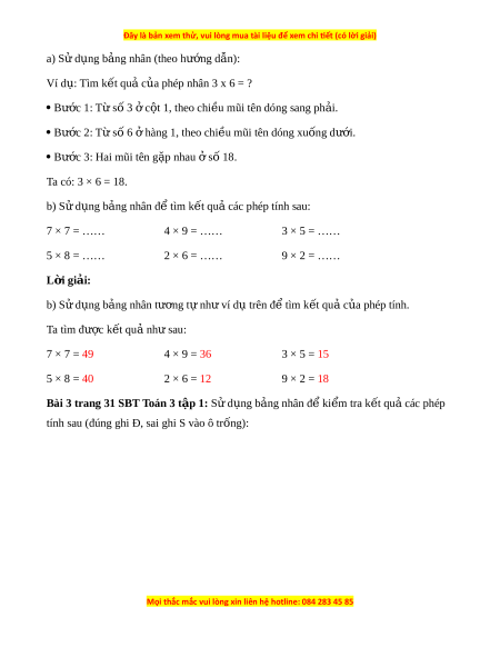 a) S d ử ng b ụ ng ả nhân (theo hư ng d ớ n ẫ ): Ví d : ụ Tìm k t ế quả c a phép nhân ủ 3 x 6 = ? Bư c ớ 1: T s ừ ố 3 c ở t ộ 1, theo chi u m ề ũi tên dóng sang ph i ả . Bư c ớ 2: T s ừ ố 6 hàng 1, t ở heo chi u m ề ũi tên dóng xu ng d ố ư i ớ . Bư c ớ 3: Hai mũi tên g p nhau ặ s ở 18. ố Ta có: 3 × 6 = 18. b) S d ử ng b ụ ng ả nhân đ t ể ìm k t ế qu các ả phép tính sau: 7 × 7 = …… 4 × 9 = …… 3 × 5 = …… 5 × 8 = …… 2 × 6 = …… 9 × 2 = …… L i ờ giải: b) S d ử ng b ụ ng ả nhân tư ng t ơ nh ự ví ư d t ụ rên đ t ể ìm k t ế qu c ả a phép t ủ ính. Ta tìm đư c ợ k t ế qu nh ả s ư au: 7 × 7 = 49 4 × 9 = 36 3 × 5 = 15 5 × 8 = 40 2 × 6 = 12 9 × 2 = 18