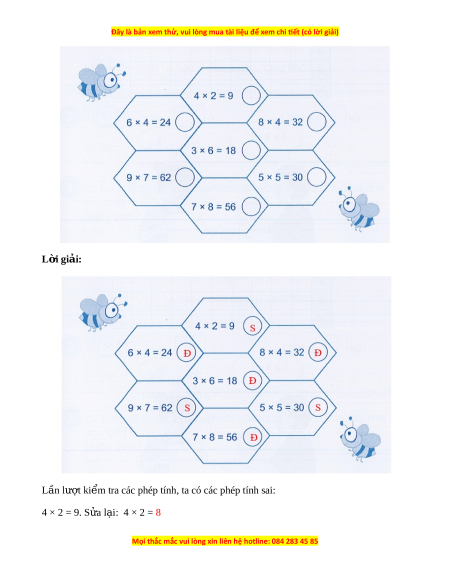 ể tra các phép tính, ta có các phép tính sai: 4 × 2 = 9. S a l ử i ạ : 4 × 2 = 8
