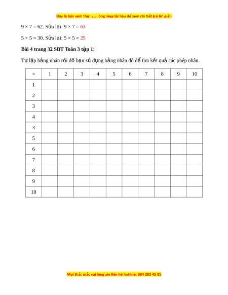 Bài 4 trang 32 SBT Toán 3 t p 1: ậ T l ự p b ậ ng ả nhân r i ồ đ b ố n s ạ d ử ng b ụ ng ả nhân đó đ t ể ìm k t ế qu các ả phép nhân. × 1 2 3 4 5 6 7 8 9 10 1 2 3 4 3 5 6 7 8 9 10