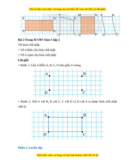 Bài 2 Trang 36 VBT Toán 3 t p 2 ậ Vẽ hình ch nh ữ t ậ . + V 4 đ ẽ nh c ỉ a hì ủ nh chữ nh t ậ + V 4 c ẽ nh ạ c a hì ủ nh chữ nh t ậ L i ờ giải + Bư c ớ 1: L y 4 đi ấ m