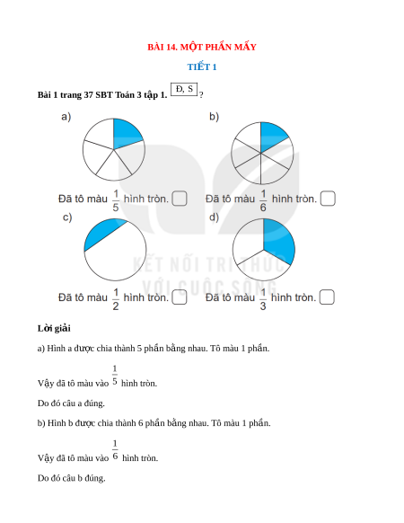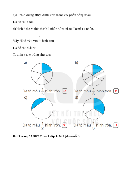 ậ đã tô màu vào 6 hình tròn. Do đó câu b đúng. c) Hình c không đư c ợ đư c chi ợ a thành các ph n b ầ ng nhau. ằ Do đó câu c sai. d) Hình d đư c chi ợ a thành 3 ph n b ầ ng nhau. ằ Tô màu 1 ph n. ầ 1 V y