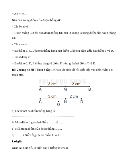 Bài 1 trang 44 SBT Toán 3 t p 1 ậ . ? Trong hình trên: a) B là trung đi m ể c a ủ đo n t ạ h ng ẳ AC b) D là trung đi m ể c a đo ủ n ạ th ng ẳ CE c) C là đi m ể gi ở a hai ữ đi m ể B và D d) D là đi m ể gi ở a ữ hai đi m ể C và E L i ờ giải Trong hình trên: a) B là trung đi m ể c a ủ đo n t ạ h ng ẳ AC Đ b) D là trung đi m ể c a đo ủ n ạ th ng ẳ CE S c) C là đi m ể gi ở a hai ữ đi m ể B và D S d) D là đi m ể gi ở a ữ hai đi m ể C và E Đ * Gi i ả thích - Câu a đúng vì: + Ba đi m ể A, B, C th ng hàng; ẳ đi m ể B n m ằ gi a ữ hai đi m ể A và C. + AB = BC. Nên B là trung đi m ể c a đo ủ n ạ th ng ẳ AC. - Câu b sai vì: + Đo n ạ th ng C ẳ D dài h n đo ơ n ạ th ng