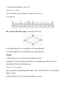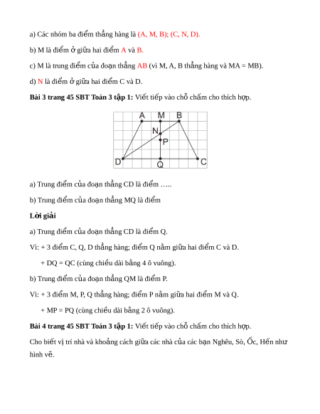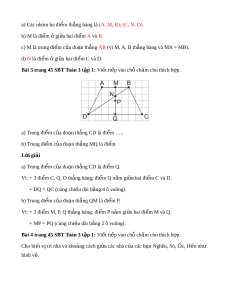 Bài 3 trang 45 SBT Toán 3 t p 1 ậ : Vi t ế ti p vào ế chỗ ch m ấ cho thích h p ợ . a) Trung đi m ể c a đo ủ n ạ th ng C ẳ D là đi m ể ….. b) Trung đi m ể c a đo ủ n ạ th ng ẳ MQ là đi m ể L i ờ giải a) Trung đi m ể c a đo ủ n ạ th ng C ẳ D là đi m ể Q. Vì: + 3 đi m ể C, Q, D th ng hàng; ẳ đi m ể Q n m ằ gi a hai ữ đi m ể C và D. + DQ = QC (cùng chi u dài ề b ng 4 ô vuông) ằ . b) Trung đi m ể c a đo ủ n ạ th ng ẳ QM là đi m ể P. Vì: + 3 đi m ể M, P, Q th ng hàng; ẳ đi m ể P n m ằ gi a hai ữ đi m ể M và Q. + MP = PQ (cùng chi u dài ề b ng ằ 2 ô vuông).