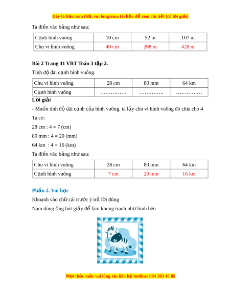 Bài 1 Trang 41 VBT Toán 3 t p 2. ậ Tính chu vi hình vuông.