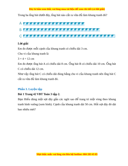 ệ đ xe ể m chi ti t (c ế ó lời gi i ả ) Trong ba ống hút dư i ớ đây, ống hút nào c t ắ ra v a ừ đ l ủ àm khung tranh đó? L i ờ giải Em đo đư c ợ mỗi c nh ạ c a khung t ủ ranh có chi u ề dài 3 cm. Chu vi c a ủ khung tranh là 3 × 4 = 12 cm Em đo đư c ợ ng ố hút A có chi u ề dài 8 cm. ng Ố hút B có chi u ề dài 10 cm. ng Ố hút C có chi u ề dài 12 cm. Như v y ậ ng ố hút C có chi u ề dài đúng b ng ằ chu vi c a ủ khung tranh nên ng ố hút C c t ắ ra v a đ ừ ủ làm khung tranh đó. Phần 3. Luy n t ệ p ậ