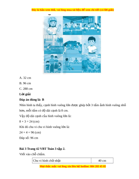 Bài 2 Trang 42 VBT Toán 3 t p 2. ậ Khoanh vào chữ cái trư c ớ ý trả l i ờ đúng. Mỗi t m ấ nh ả c a ủ các b n ạ trong t ổ đ u ề là hình vuông c nh ạ 8 cm. Hình vuông l n ớ đư c ghép ợ b i ở 9 t m ấ nh ả nh t ư h có chu vi ế là: M i