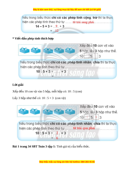 ế dấu phép tính thích h p ợ L i ờ giải X p ế đ u 10 con v ề ịt vào 5 h p, m ộ i ỗ h p ộ có: 10 : 5 (con) Lấy 3 h p nh ộ t ư h có: ế 10 : 5 × 3 (con v t ị )