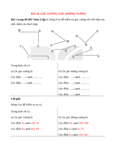 Góc đỉnh …..; c nh …., ….. ạ L i ờ giải Dùng ê ke đ ki ể m ể tra ta có: Trong hình vẽ có: a) Các góc vuông là: