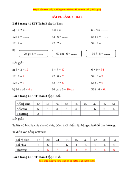 Bài 1 trang 41 SBT Toán 3 t p 1 ậ : Tính: a) 6 × 2 = …… 6 × 7 = …… 6 × 9 = ……. 12 : 6 = …… 42 : 6 = …… 54 : 6 = …… 12 : 2 = …… 42 : 7 = …… 54 : 9 = …… b) 24 g : 6 = …… 60 cm : 6 = …… 36 l : 6 = …… L i ờ giải: a) 6 × 2 = 12 6 × 7 = 42 6 × 9 = 54 12 : 6 = 2 42 : 6 = 7 54 : 6 = 9 12 : 2 = 6 42 : 7 = 6 54 : 9 = 6 b) 24 g : 6 = 4 g 60 cm : 6 = 10 cm 36 l : 6 = 6 l