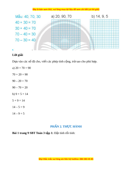 ự vào các số đã cho, vi t ế các phép tính c ng, ộ tr s ừ ao cho phù h p ợ . a) 20 + 70 = 90 70 + 20 = 90 90 – 20 = 70 90 – 70 = 20 b) 9 + 5 = 14 5 + 9 = 14 14 – 5 = 9 14 – 9 = 5 PHẦN 2. TH C Ự HÀNH