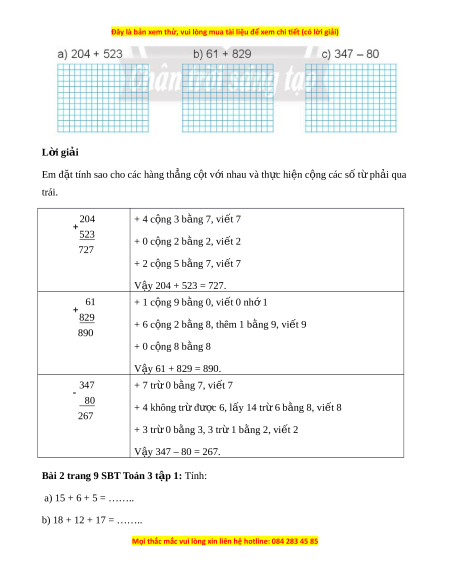 ặ tính sao cho các hàng th ng ẳ c t ộ v i ớ nhau và th c hi ự n c ệ ng các ộ s t ố ph ừ i ả qua trái. 204 + 4 c ng ộ 3 b ng 7, vi ằ t ế 7 523 + 0 c ng ộ 2 b ng 2, vi ằ t ế 2 727 + 2 c ng ộ 5 b ng 7, vi ằ t ế 7 V y ậ 204 + 523 = 727. 61 + 1 c ng ộ 9 b ng 0, vi ằ t ế 0 nh 1 ớ 829 + 6 c ng ộ 2 b ng 8, t ằ hêm 1 b ng ằ 9, vi t ế 9 890 + 0 c ng ộ 8 b ng 8 ằ V y ậ 61 + 829 = 890. 347 + 7 tr 0 b ừ ng 7, vi ằ t ế 7 80 + 4 không tr đ ừ ư c 6, l ợ ấy 14 tr 6 b ừ ng 8, vi ằ t ế 8 267 + 3 tr 0 b ừ ng 3, 3 t ằ r 1 b ừ ng ằ 2, vi t ế 2 V y ậ 347 – 80 = 267.