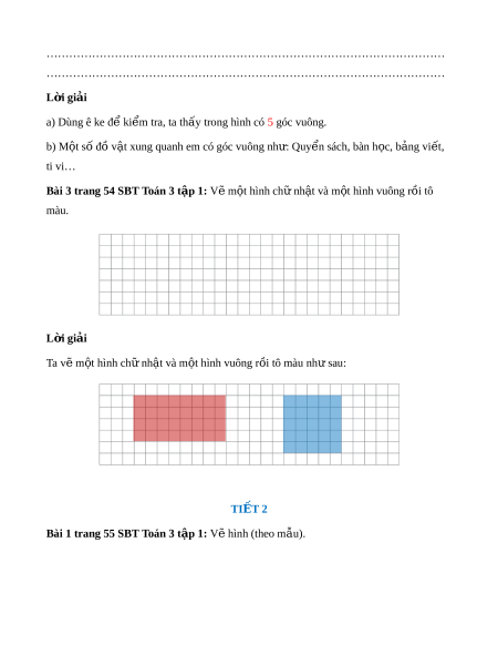 Bài 3 trang 54 SBT Toán 3 t p 1 ậ : Vẽ m t ộ hình ch nh ữ t ậ và m t ộ hình vuông r i ồ tô màu. L i ờ giải Ta vẽ m t ộ hình chữ nh t ậ và m t ộ hình vuông r i ồ tô màu nh s ư au: TI T Ế 2
