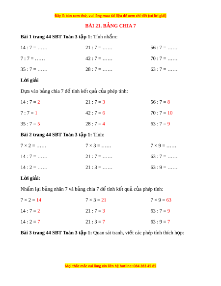 Bài 2 trang 44 SBT Toán 3 t p 1 ậ : Tính: 7 × 2 = …… 7 × 3 = …… 7 × 9 = …… 14 : 7 = …… 21 : 7 = …… 63 : 7 = …… 14 : 2 = …… 21 : 3 = …… 63 : 9 = …… L i ờ giải: Nhẩm l i ạ b ng ả nhân 7 và b ng ả chia 7 đ t ể ính k t ế qu c ả a phép t ủ ính: 7 × 2 = 14 7 × 3 = 21 7 × 9 = 63 14 : 7 = 2 21 : 7 = 3 63 : 7 = 9 14 : 2 = 7 21 : 3 = 7 63 : 9 = 7