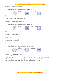 63 gi m ả 7 lần, ta đư c ợ s : ố 63 : 7 = 9 V y ậ hai số c n đi ầ n vào ô t ề rống l n l ầ ư t ợ là 63; 9 gấp 9 gi m ả 7 lần 7 lần 63 9 b) 7 gấp 8 lần ta đư c s ợ ố: 7 × 8 = 56 56 gi m ả 7 lần, ta đư c ợ s : ố 56 : 7 = 8 V y ậ hai số c n đi ầ n vào ô t ề rống l n l ầ ư t ợ là 56; 8. gấp 8 gi m ả 7 lần 7 lần 56 8 c) 21 gi m ả 7 lần ta đư c ợ s : ố 21 : 7 = 3 3 gấp 6 lần ta đư c s ợ ố: 3 × 6 = 18 V y ậ hai số c n đi ầ n vào ô t ề rống l n l ầ ư t ợ là 3; 18. gi m ả 7 gấp 6 lần 21 lần 3 18