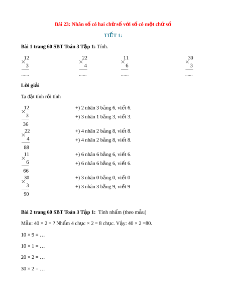 Bài 1 trang 60 SBT Toán 3 T p 1 ậ : Tính. 12 22 11 30 3 4 6 3 ...... ...... ...... ...... L i ờ giải Ta đ t ặ tính rồi tính 12 +) 2 nhân 3 b ng ằ 6, vi t ế 6. 3 +) 3 nhân 1 b ng ằ 3, vi t ế 3. 36 22 +) 4 nhân 2 b ng ằ 8, vi t ế 8. 4 +) 4 nhân 2 b ng ằ 8, vi t ế 8. 88 11 +) 6 nhân 6 b ng ằ 6, vi t ế 6. 6 +) 6 nhân 6 b ng ằ 6, vi t ế 6. 66 30 +) 3 nhân 0 b ng ằ 0, vi t ế 0 3 +) 3 nhân 3 b ng ằ 9, vi t ế 9 90