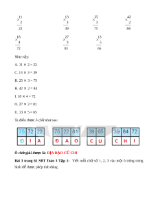 ặ tính rồi tính, ta đư c: ợ 12 +) 6 nhân 2 b ng ằ 12, vi t ế 2, nh 1. ớ 6 +) 6 nhân 1 b ng ằ 6, thêm 1 b ng 7, vi ằ t ế 7. 72 28 +) 3 nhân 8 b ng ằ 24, vi t ế 4, nh 2. ớ 3 +) 3 nhân 2 b ng ằ 6, thêm 2 b ng 8, vi ằ t ế 8. 84 45 +) 4 nhân 4 b ng ằ 16, vi t ế 6, nh 1. ớ 2 +) 4 nhân 2 b ng ằ 8, thêm 1 b ng 9, vi ằ t ế 9. 90 24 +) 2 nhân 5 b ng ằ 10, vi t ế 0, nh 1. ớ 4 +) 2 nhân 4 b ng ằ 8, thêm 1 b ng 9, vi ằ t ế 9 96