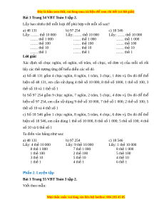 ụ nghìn, 8 nghìn, 5 trăm, 4 ch c, ụ 6 đ n ơ v .ị Do đó đ ể thể hiện số 18 546, em c n ầ dùng 1 th ẻ s ố 10 000, 8 th ẻ s ố 1 000; 5 th ẻ s ố 100; 4 thẻ số 10 và 6 thẻ số 1 Ta đi n vào b ề ng nh ả ư sau: a) 48 131 b) 97 254 c) 18 546 Lấy: 4 th 10 000 ẻ Lấy: 9 thẻ 10 000 Lấy: 1 th 10 000 ẻ 8 thẻ 1 000 7 thẻ 1 000 8 thẻ 1 000 1 thẻ 100 2 thẻ 100 5 thẻ 100 3 thẻ 10 5 thẻ 10 4 thẻ 10 1 thẻ 1 4 thẻ 1 6 thẻ 1 Phần 2. Luy n t ệ p ậ