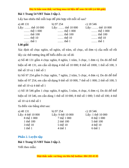 Bài 1 Trang 54 VBT Toán 3 t p 2. ậ Lấy bao nhiêu th m ẻ ỗi lo i ạ đ phù h ể p v ợ i ớ m i ỗ s s ố au? a) 48 131 b) 97 254 c) 18 546 Lấy: …… th 10 000 ẻ Lấy: …… thẻ 10 000 Lấy: …… th 10 000 ẻ …… thẻ 1 000 …… thẻ 1 000 …… thẻ 1 000 …… thẻ 100 …… thẻ 100 …… thẻ 100 …… thẻ 10 …… thẻ 10 …… thẻ 10 …… thẻ 1 …… thẻ 1 …… thẻ 1 L i ờ giải Xác đ nh ị số ch c