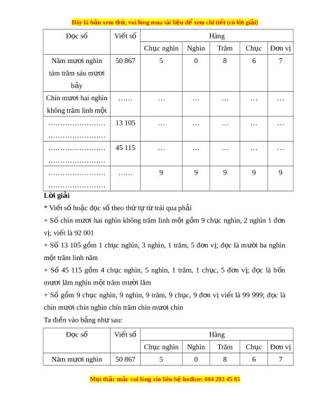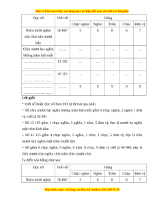 ệ đ xe ể m chi ti t (c ế ó lời gi i ả ) Đ c s ọ ố Vi t ế số Hàng Chục nghìn Nghìn Trăm Chục Đ n ơ vị Năm mư i ơ nghìn 50 867 5 0 8 6 7 tám trăm sáu mư i ơ b y ả Chín mư i ơ hai nghìn …… … … … … … không trăm linh m t ộ …………………… 13 105 … … … … … …………………… …………………… 45 115 … … … … … …………………… …………………… …… 9 9 9 9 9 …………………… L i ờ giải * Vi t ế số ho c ặ đ c s ọ ố theo thứ t t ự t ừ rái qua ph i ả + Số chín mư i