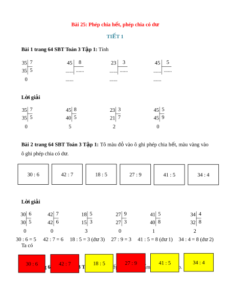 ậ 1: Tô màu đỏ vào ô ghi phép chia h t ế , màu vàng vào ô ghi phép chia có d . ư 30 : 6 42 : 7 18 : 5 27 : 9 41 : 5 34 : 4 L i ờ giải 30 6 42 7 18 5 27 9 41 5 34 4 30 5 42 6 15 3 27 3 40 8 32 8 0 0 3 0 1 2 30 : 6 = 5 42 : 7 = 6 18 : 5 = 3 (d 3) ư 27 : 9 = 3 41 : 5 = 8 (d 1 ư ) 34 : 4 = 8 (d 2) ư Ta có 30 : 6 42 : 7 18 : 5 27 : 9 41 : 5 34 : 4