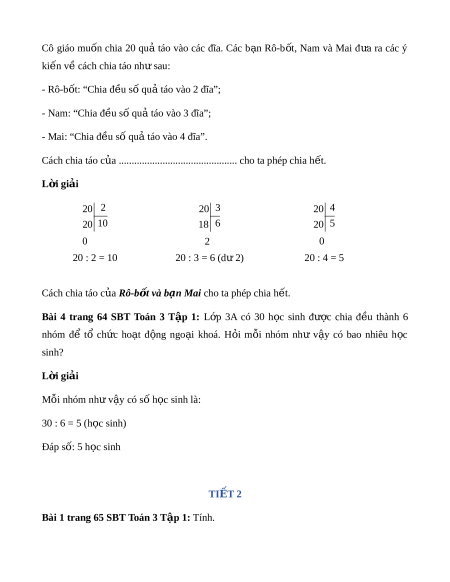 ố chia 20 quả táo vào các đĩa. Các b n ạ Rô-b t ố , Nam và Mai đ a ư ra các ý ki n v ế ề cách chia táo như sau: - Rô-b t ố : “Chia đ u s ề qu ố t ả áo vào 2 đĩa”; - Nam: “Chia đ u s ề qu ố t ả áo vào 3 đĩa”; - Mai: “Chia đ u s ề qu ố ả táo vào 4 đĩa”. Cách chia táo c a