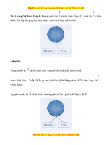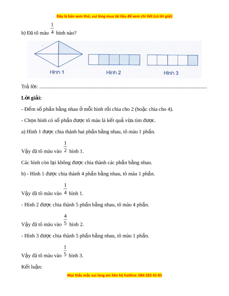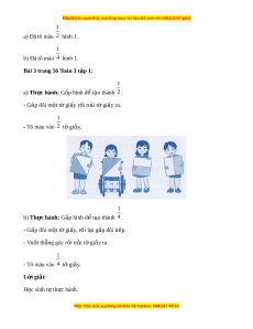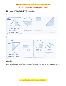 ờ : ................................................................................................................................ L i ờ giải: - Đ m ế số ph n b ầ ng nhau ằ m ở ỗi hình r i ồ chia cho 2 (ho c chi ặ a cho 4). - Ch n ọ hình có s ph ố n đ ầ ư c t ợ ô màu là k t ế qu v ả a t ừ ìm đư c. ợ a) Hình 1 đư c ợ chia thành hai ph n b ầ ng nhau, t ằ ô màu 1 ph n. ầ 1 V y