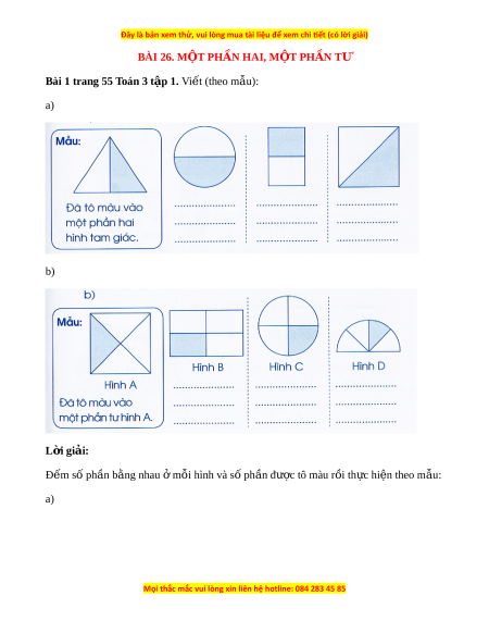 Bài 1 trang 55 Toán 3 t p 1. ậ Vi t ế (theo mẫu): a) b) L i ờ giải: Đ m ế số phần b ng ằ nhau m ở ỗi hình và s ph ố n đ ầ ư c t ợ ô màu r i ồ th c ự hi n t ệ heo m u ẫ : a)