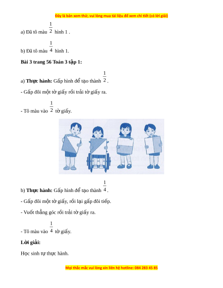 b) Thực hành: Gấp hình đ t ể o ạ thành 4 . - Gấp đôi m t ộ t gi ờ ấy, rồi l i ạ gấp đôi ti p. ế - Vuốt th ng góc r ẳ i ồ tr i ả t gi ờ y r ấ a. 1 - Tô màu vào 4 t gi ờ ấy. L i ờ giải: H c ọ sinh t t ự h c ự hành.