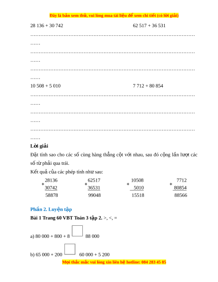 Bài 1 Trang 60 VBT Toán 3 t p 2. ậ >, <, = a) 80 000 + 800 + 8 88 000 b) 65 000 + 200 60 000 + 5 200 M i