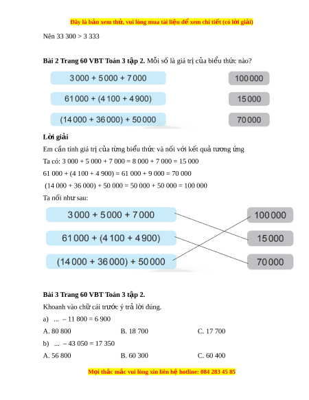 Bài 2 Trang 60 VBT Toán 3 t p 2. ậ Mỗi số là giá tr c ị a bi ủ u ể th c ứ nào? L i ờ giải Em cần tính giá tr c ị a ủ t ng bi ừ u t ể h c và n ứ i ố v i ớ k t ế qu t ả ư ng ơ ng ứ