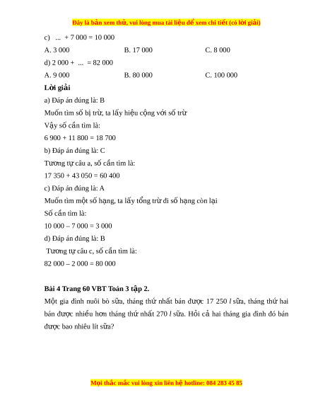Bài 3 Trang 60 VBT Toán 3 t p 2. ậ Khoanh vào chữ cái trư c ớ ý trả l i ờ đúng. a) ... – 11 800 = 6 900 A. 80 800 B. 18 700 C. 17 700 b) ... – 43 050 = 17 350 A. 56 800 B. 60 300 C. 60 400 M i